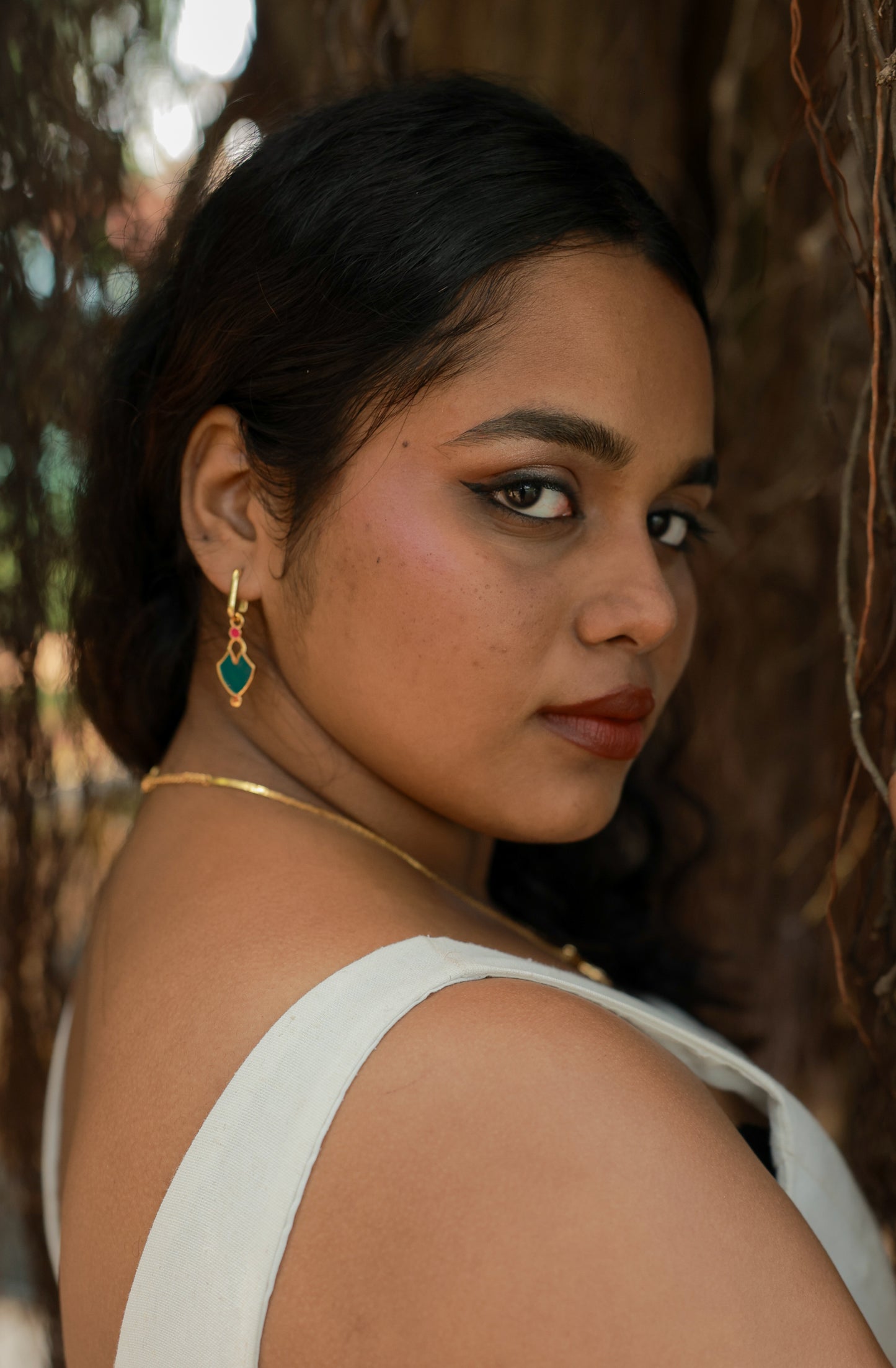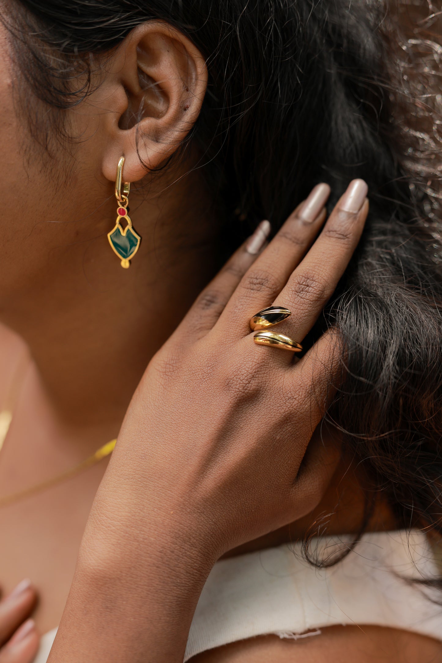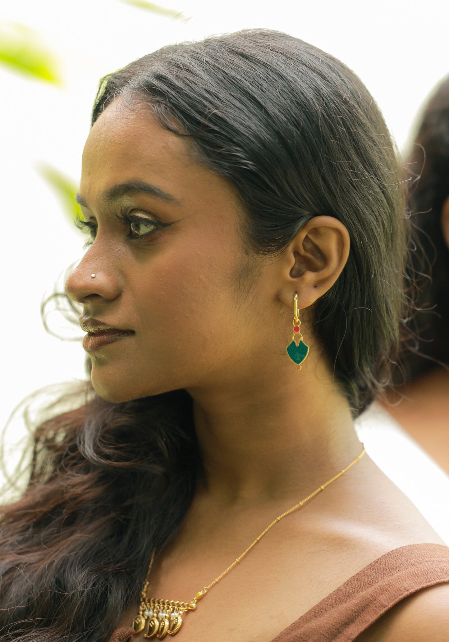 The Vimala Detachable Enamel Charm Drop Earrings bring the Palakka (leaf) motif's heritage into the everyday. Delicately crafted in a slender drop silhouette, each Palakka form is accented with emerald rich green enamel and topped with a pop of pink, creating a vibrant yet balanced palette.