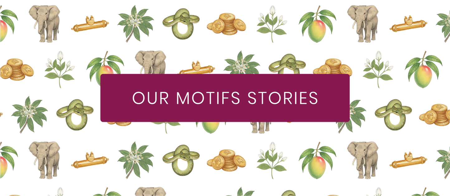 The Aanavaal motif is inspired by the elephant, a sacred figure in South Indian culture symbolising wisdom, protection, and enduring strength. Traditionally, jewellery was crafted from the coarse hair of the elephant’s tail, believed to bring good fortune and guard its wearer from harm. These talismans were worn close to the body, often discreetly, yet held deep personal significance.