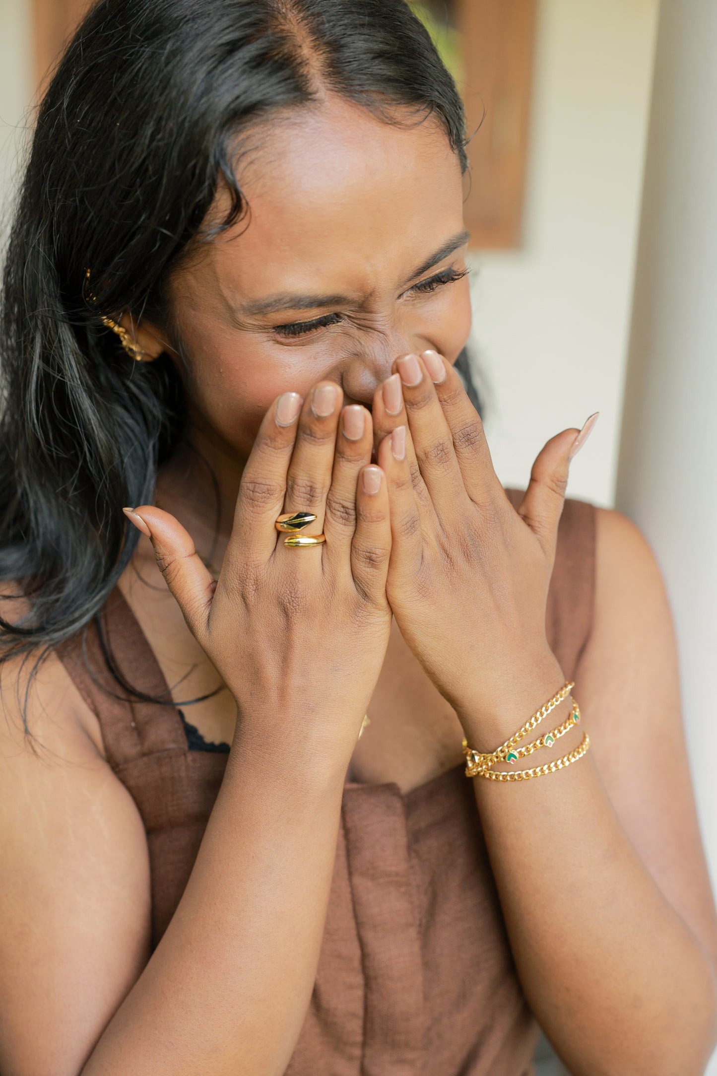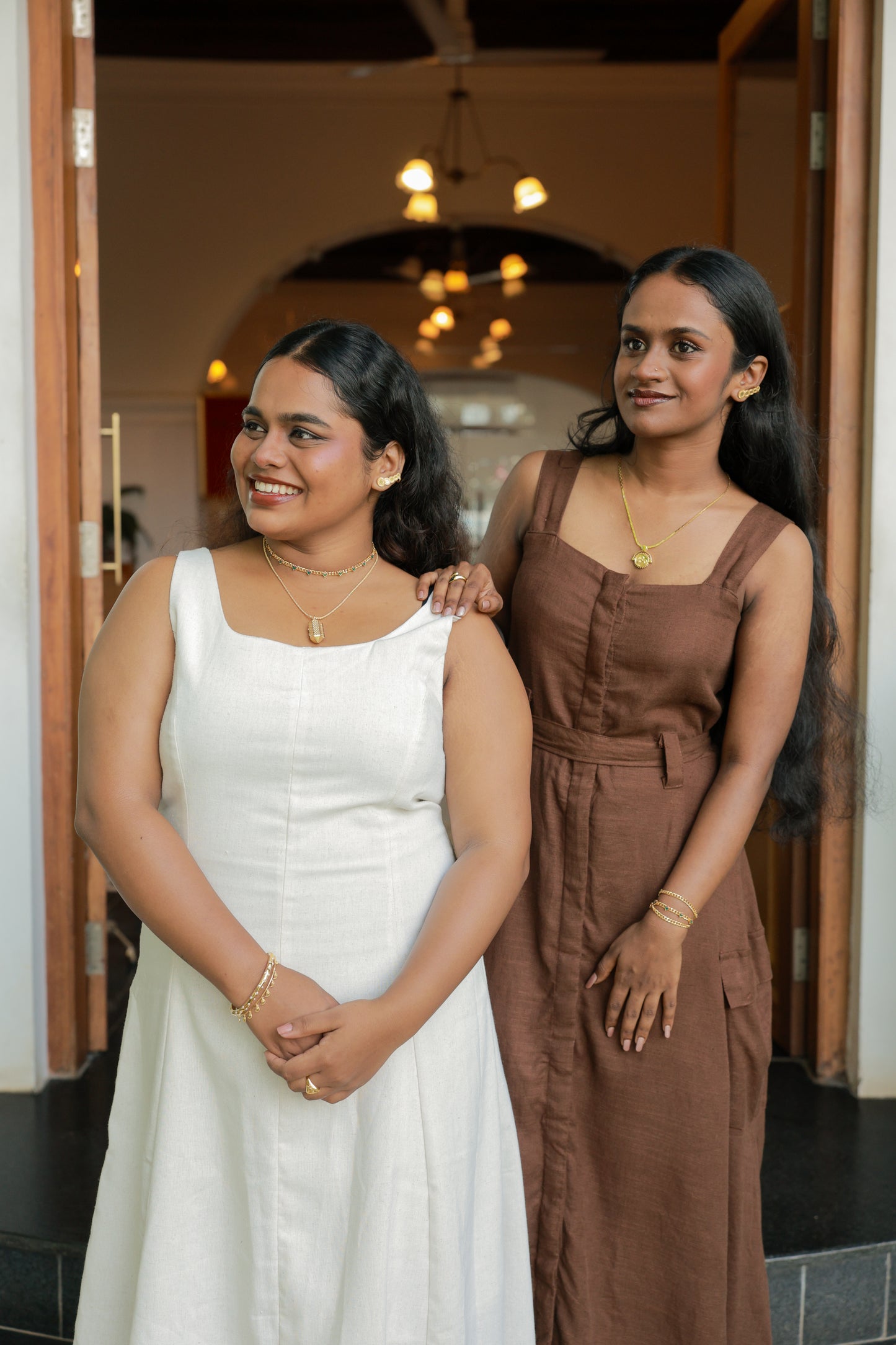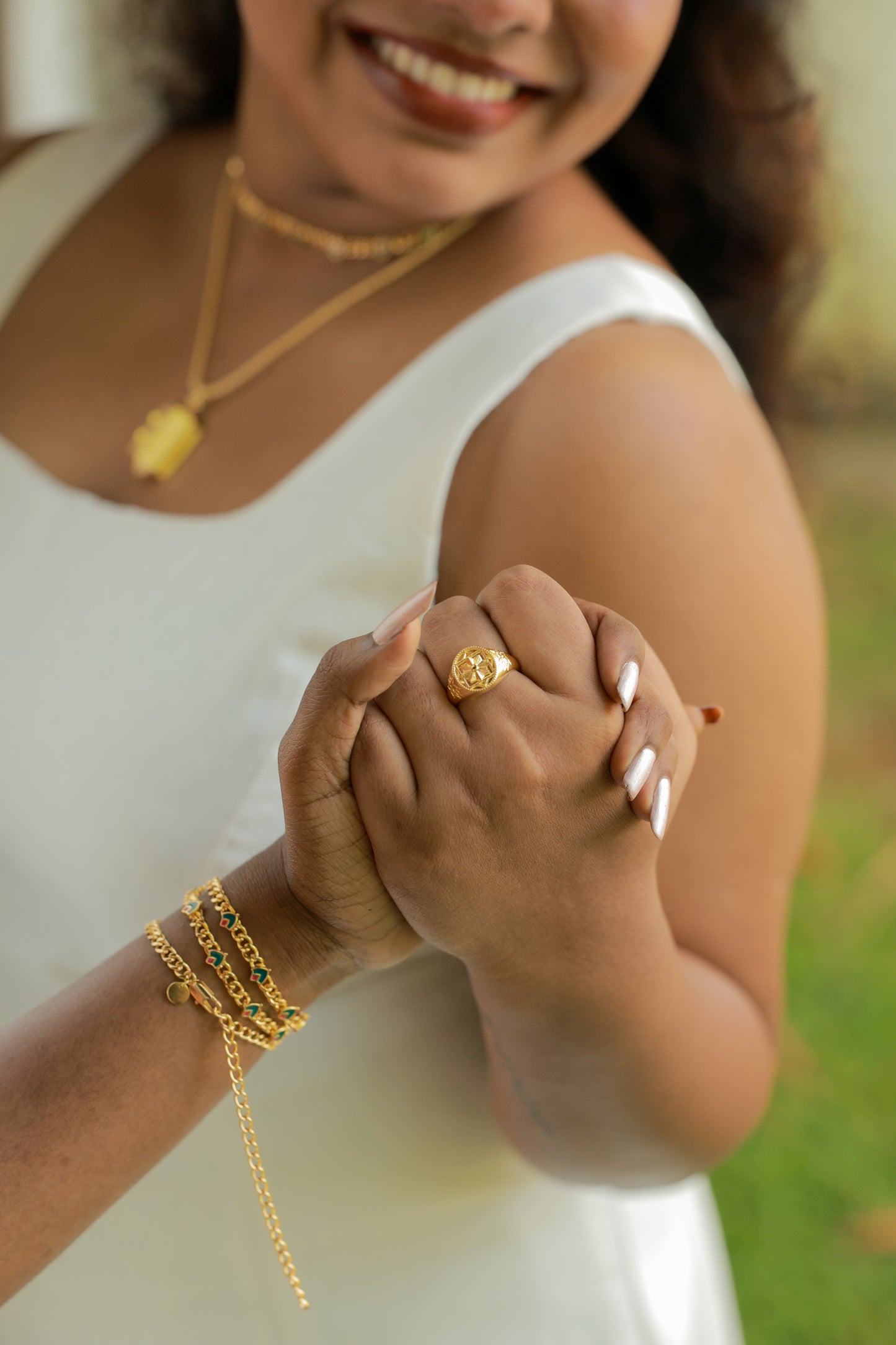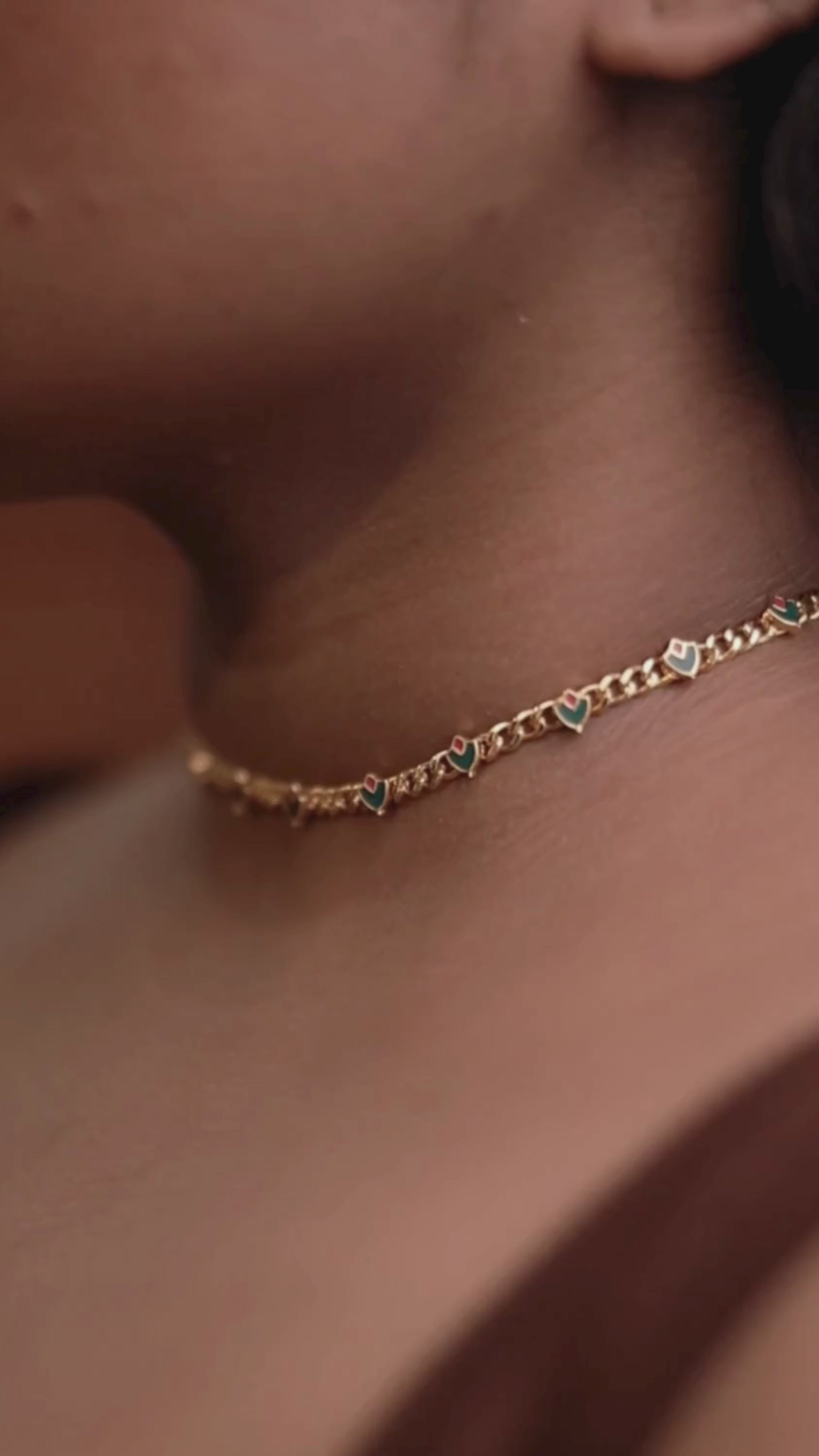 In the Lavi Gold & Enamel Charm Choker-to-Bracelet, the Palakka (leaf) motif is reimagined in a repeating pattern along a modern curb chain, blending cultural nostalgia with a touch of edge. Finished with subtle emerald green and red enamel accents, it brings colour, texture, and movement to the neckline.