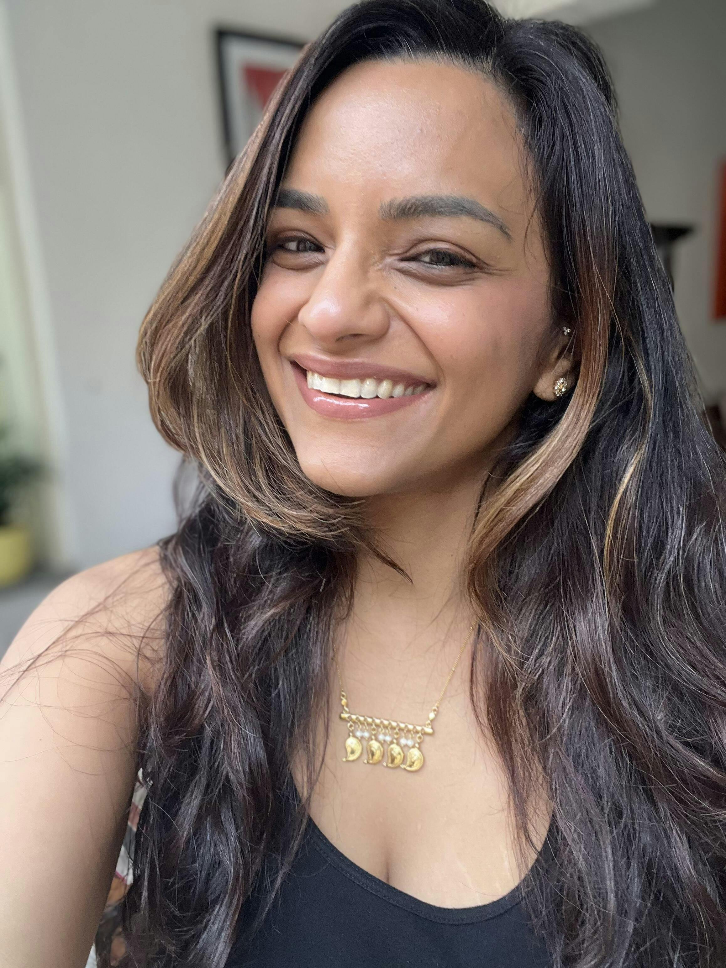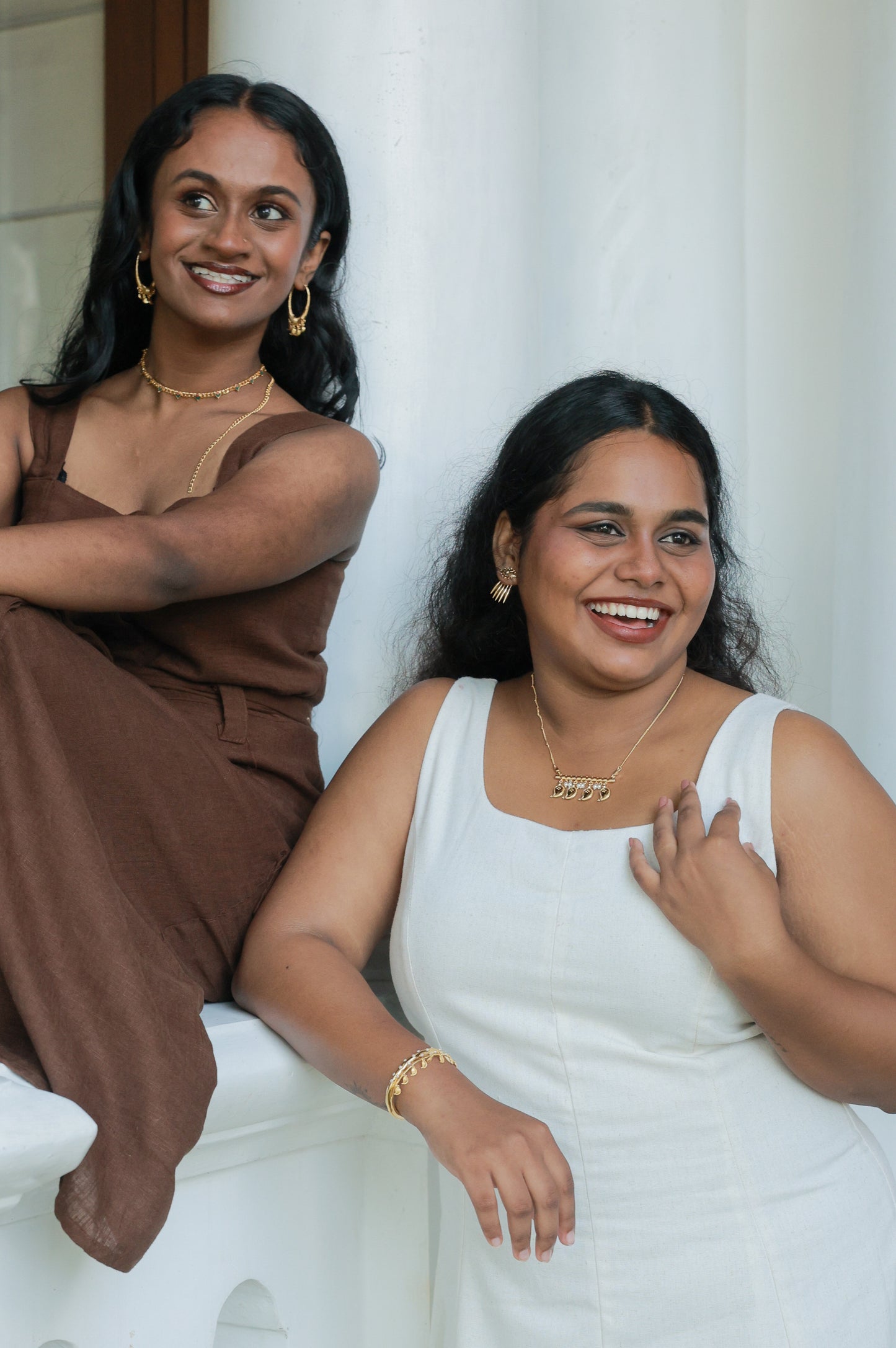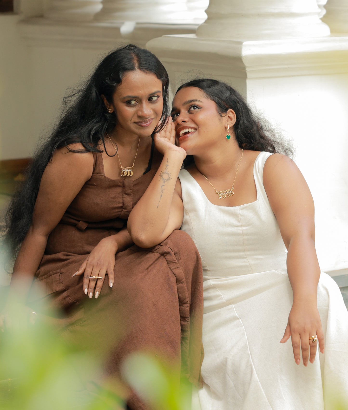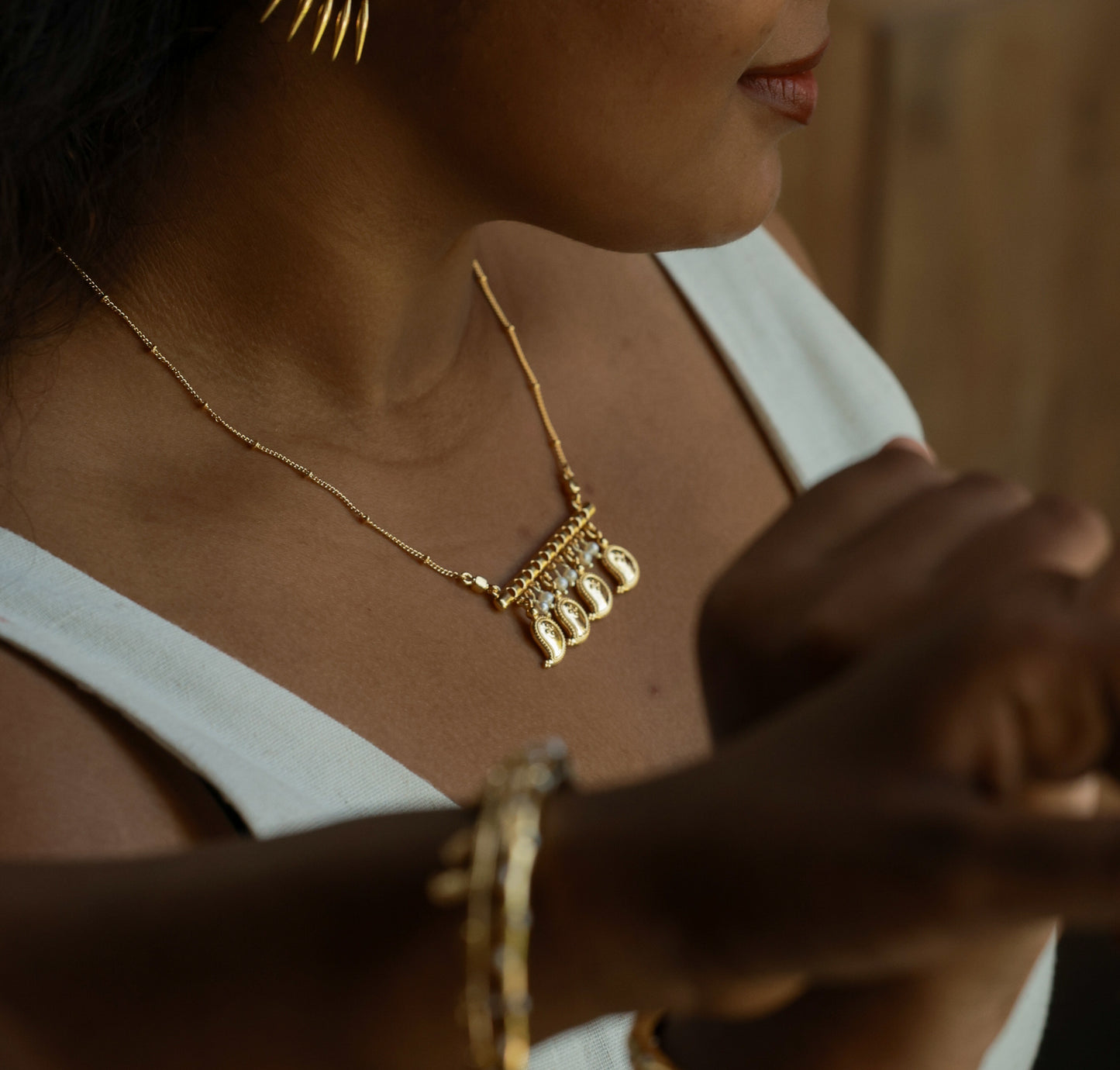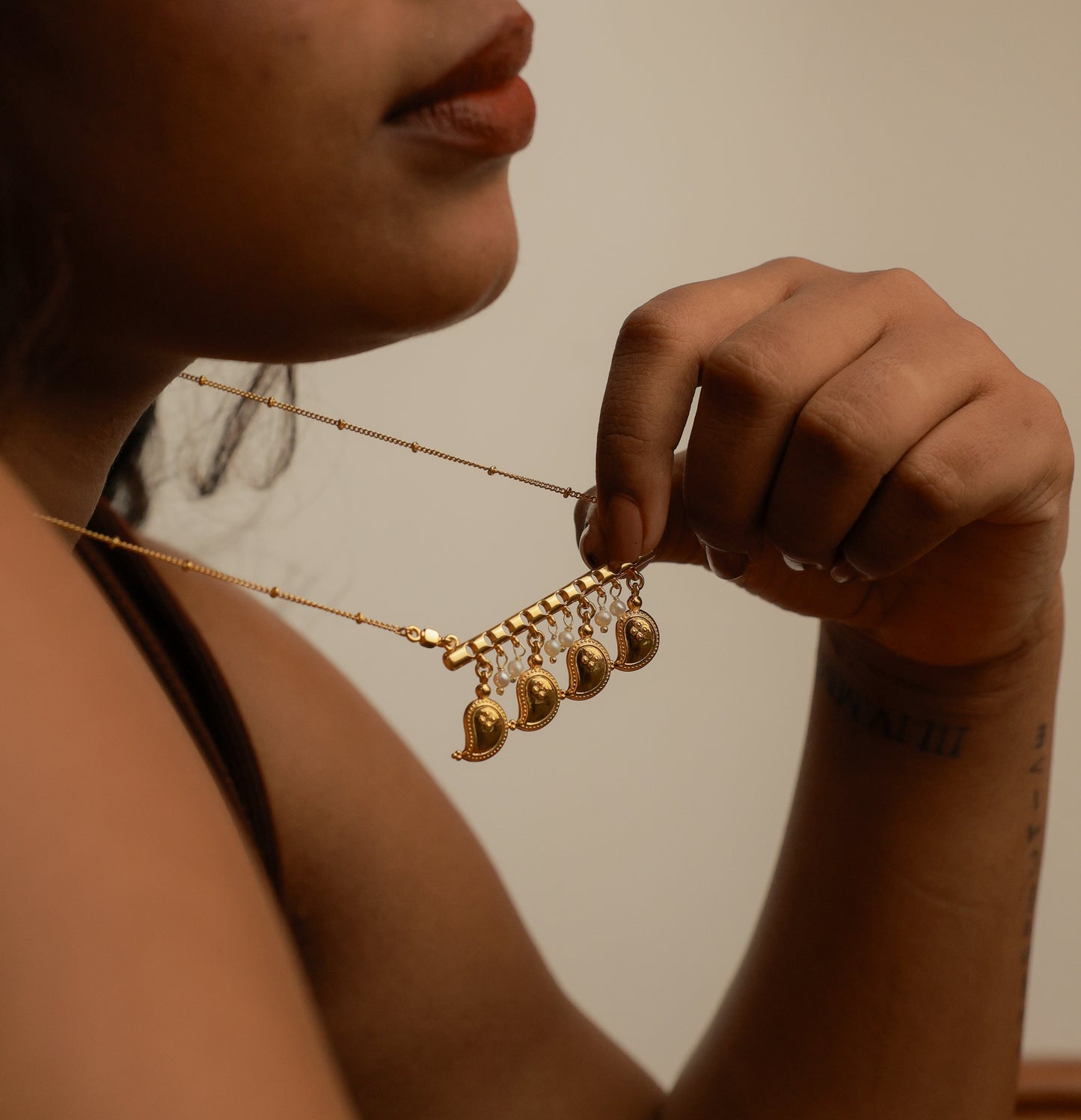 The Venu Bar Necklace with Pearls & Mango Charms necklace takes a classic South Indian motif and frames it in a minimal, architectural design. Four mango charms, each finely detailed, are suspended from a slim horizontal bar inspired by the flute, punctuated with delicate pearls for contrast and softness.